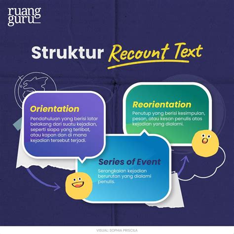 Struktur biographical recount text dalam Struktur recount text terdiri dari tiga bagian utama: Orientation, Events, dan Reorientation. Siapa yang terlibat (tokoh). Kapan peristiwa terjadi (waktu). Di mana peristiwa .